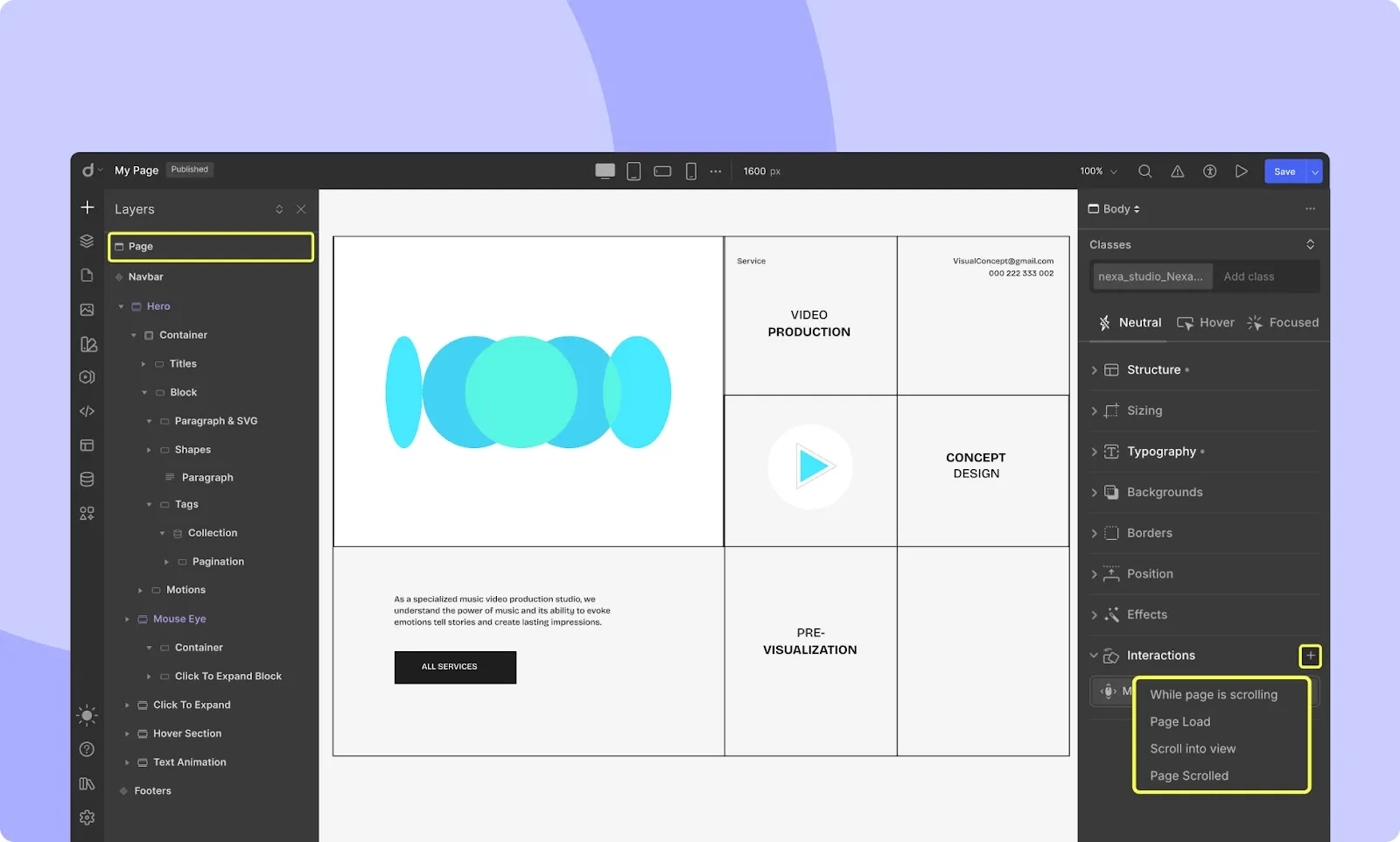 For a Page Trigger: In the Layers panel, select Page, then click the + icon next to Interactions on the style panel.